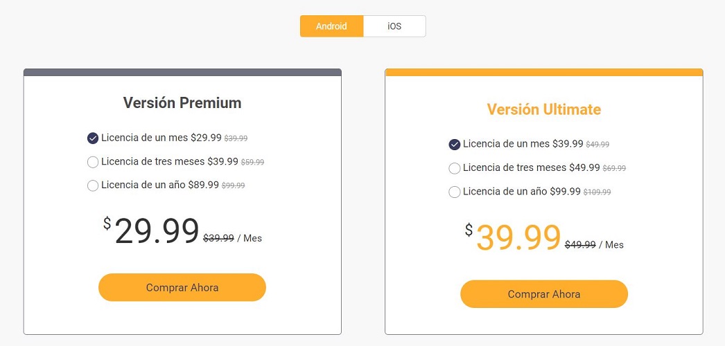 Tenemos diferentes precios según la versión que elijamos en Android (Premium o Ultimate) o iOS, así como si escogemos suscripción mensual, trimestral o anual. Por ejemplo, la suscripción mensual de iOS tiene un coste de 39.99 dólares, pero en Android podemos ahorrar bastante si, por ejemplo, escogemos el plan Ultimate (mucho más completo y con más posibilidades) en su versión de suscripción anual, con un único pago de 99.99 dólares (8.33 dólares al mes). Puedes ver todos los precios aquí.