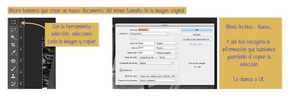 Lo que yo hago es, con la herramienta selección, hacer una selección (valga la redundancia) de toda la imagen... una vez hecho esto le doy a copiar (cmd+ c ó ctrl+c según uséis mac o windows). ¿Ya? Pues ahora iremos al menú archivo y seleccionamos nuevo. Ahí veremos que está recogiendo la información del portapapeles, que es dónde hemos enviado la información del copiado anterior. Le damos a OK y continuamos... :D