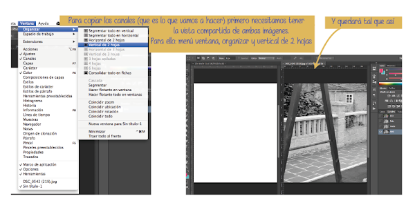 Para poder copiar un canal de un archivo a otro necesitamos tener los dos archivos visibles para poder arrastrar (literalmente) el canal. ¿Y cómo ponemos las dos imágenes para poder verlas a la vez? Pues muuuuy sencillo, vamos al menú ventana, organizar y seleccionamos vertical de 2 hojas y ¡tachán!