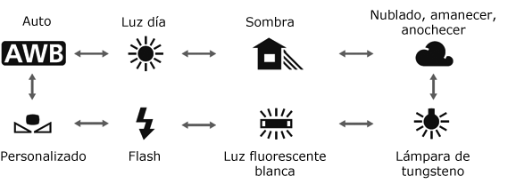 En la parte de detrás de tu cámara verás un botón donde esta escrito WB. Si pinchas ese botón vas a navegar por el menú de balance de blancos.
