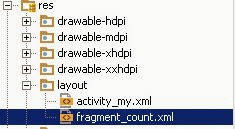 Luego cambia la etiqueta FrameLayout por RelativeLayout para que los componentes puedan reacomodarse. Con estas modificaciones el código de fragment_count.xml tendría la siguiente forma:<RelativeLayout xmlns:android="http://schemas.android.com/apk/res/android"