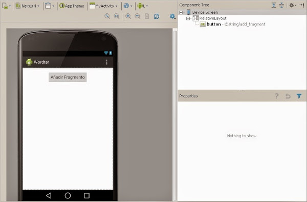 Como ejemplo, añadiremos el fragmento anterior. Para ello primero debes eliminar el nodo <fragment> del layout de nuestra actividad y luego añadir un nuevo botón a la actividad con el id "add_fragment" y el texto "Añadir Fragmento":