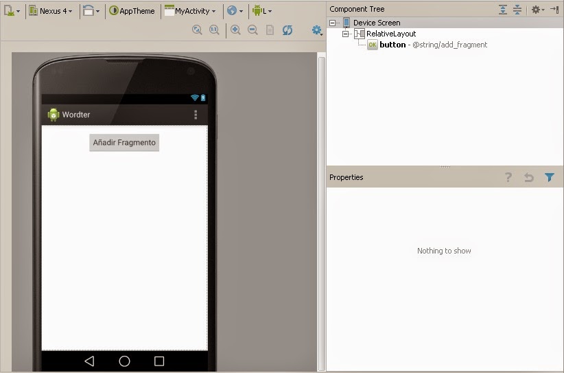 Como ejemplo, añadiremos el fragmento anterior. Para ello primero debes eliminar el nodo <fragment> del layout de nuestra actividad y luego añadir un nuevo botón a la actividad con el id "add_fragment" y el texto "Añadir Fragmento":