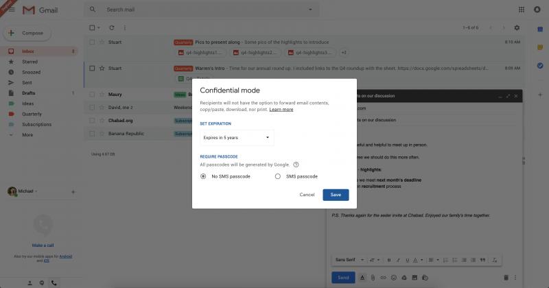 Otra de las opciones de seguridad disponibles será el “Modo Confidencial”, que haría que el destinatario tenga que recibir un código por SMS para acceder al contenido; aunque todavía no se sabe si existirá cifrado de la información o si funcionará con otros servicios de correo como el de Microsoft, pensamos que probablemente sólo funcione entre clientes de Google.