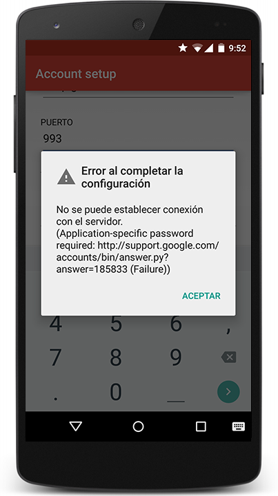 Si tienes la verificación en dos pasos activa, como no estamos tratando la cuenta como de Google al utilizar la clave se producirá el error de la imagen anterior. Para evitarlo desactiva la verificación en dos pasos o mejor aún crea una contraseña de aplicación. Cómo iniciar sesión mediante contraseñas de aplicación - Ayuda de Cuentas de Google