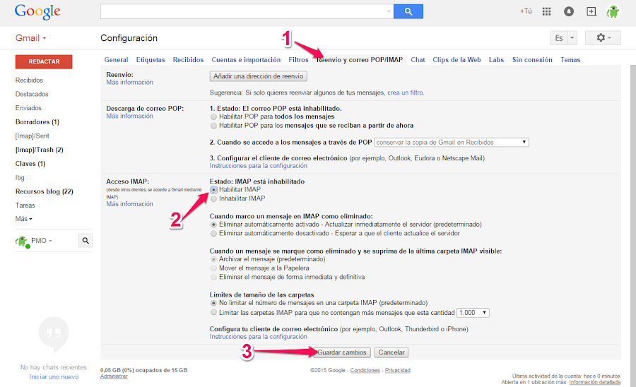 Si el error indica que no se puede establecer conexión con el servidor. Ve a la web de Gmail y entra en la configuración pulsando la rueda dentada. Una vez dentro pasa a la pestaña Reenvío y correo POP/IMAP, en el apartado Acceso IMAP elige habilitar IMAP. En las opciones siguientes puedes configurar el comportamiento de IMAP.