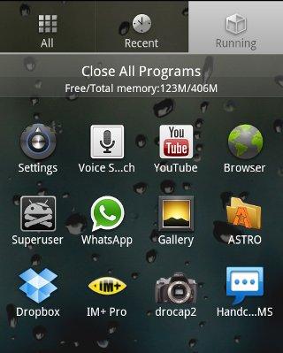 Al entrar en el cajón de la aplicación, la primera pestaña mostrará toda la aplicación instalada. Puede configurarlo para que se desplace horizontal o verticalmente. Ahora, cuando puntee en la pestaña Reciente, verá todas las aplicaciones que ha utilizado recientemente. Pulse sobre el botón «Borrar historial» para borrar la lista. En la pestaña Ejecutar se encuentra la lista de aplicaciones que se están ejecutando actualmente en segundo plano. Si su teléfono funciona lentamente, puede tocar rápidamente el botón «Cerrar todos los programas» para cerrar todo de una vez. Esto le ahorrará la necesidad de instalar otra aplicación de task killer del mercado.