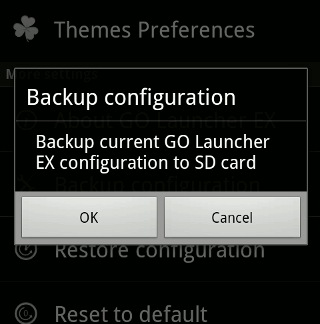 Por último, pero no menos importante, Go Launcher Ex también le permite realizar copias de seguridad y restaurar su configuración. Si estás usando varios teléfonos Android (o siempre estás flasheando nuevas ROMs), puedes fácilmente hacer una copia de seguridad de tu configuración en la tarjeta SD.