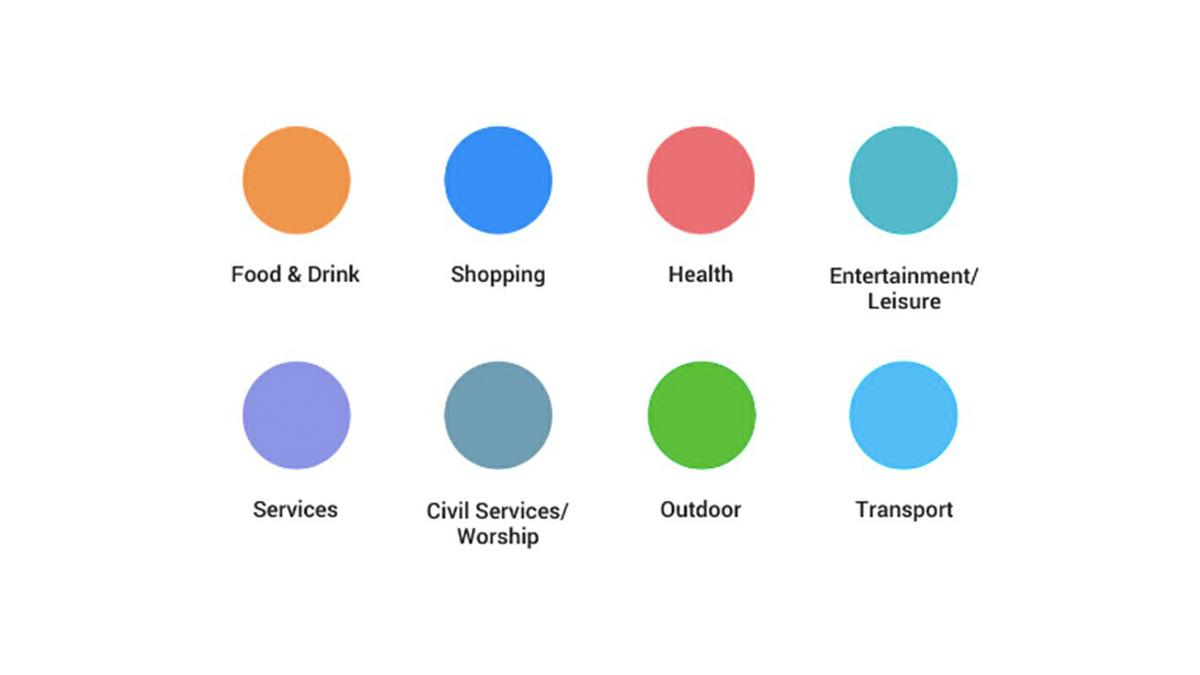 Los lugares de comida y bebida ahora son naranjas, los lugares comerciales permanecen en azul, rosa para la salud, turquesa para ocio y entretenimiento; verde para áreas al aire libre; y azul más claro para transporte. Así mismo habrá íconos para los caminos cerrados, construcciones y accidentes automovilísticos.