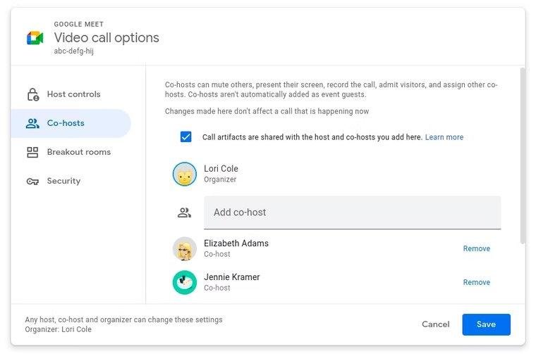 El anfitrión principal es responsable de enviar los artefactos a cada uno de los coanfitriones a través del correo electrónico. Esto puede ser una carga dependiendo de la frecuencia con la que se organizan y se reúnen los coanfitriones en Meet. Si creas un evento en Google Calendar y añades coanfitriones al mismo tiempo, Google compartirá automáticamente los artefactos de la reunión con esas personas a posteriori. Al añadir coanfitriones, es necesario marcar una casilla para compartir los artefactos de la convocatoria.