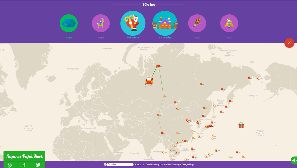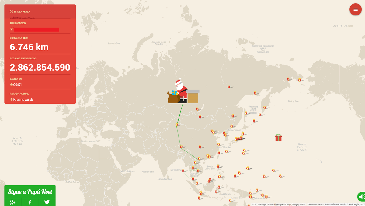 2) Descubre la localización del trineo de Santa y cuántos regalos ha realizado hasta el momento: