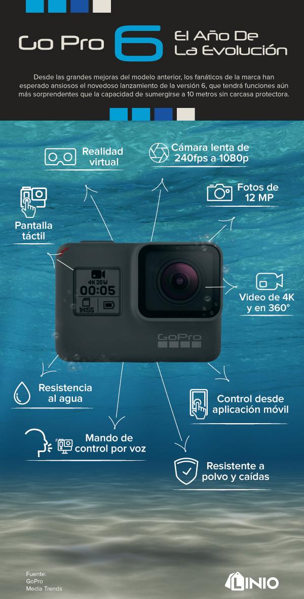 Una de las características más importantes, vendría de la mano de la Realidad Virtual, donde la cámara de acción será la plataforma para que los usuarios puedan realizar videos 360°. Sumado a todo esto, están las maravillosas mejoras que hubo en el modelo 5, como el control de voz, la pantalla táctil, GPS y estabilizador de imagen.