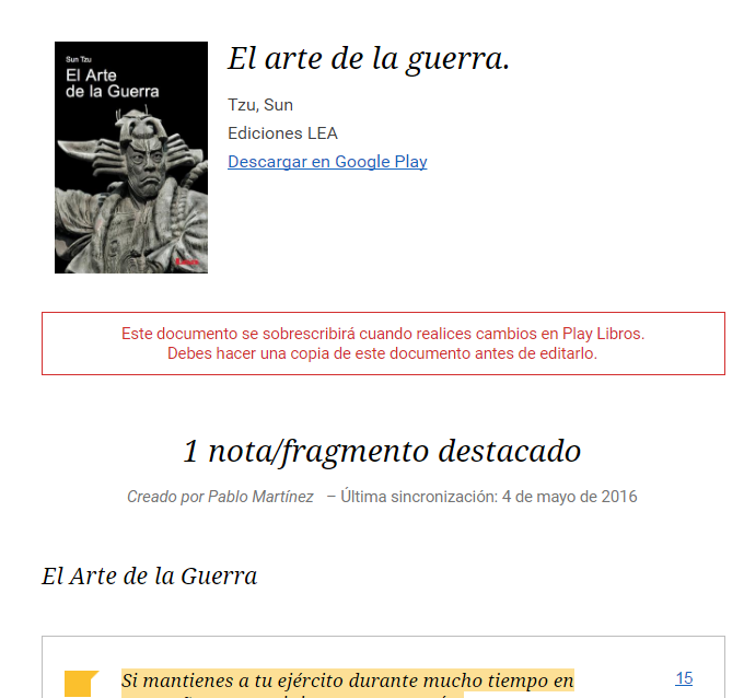Nota muy Importante: Como se indica en rojo en el documento de ejemplo cada vez que añadas un marcador, crees una nueva nota o subrayes cualquier texto en un libro, el documento de Drive correspondiente a ese libro se borrará y se creará nuevo. De tal manera que se perderán todos los cambios que hayas realizado directamente en el documento. Para hacer cambios en el documento primero tienes que crear una copia del mismo, por desgracia esa copia no se actualizará si añades más notas desde el libro. Truco: Si activas la sincronización y ya tenías notas en un libro puedes hacer que se cree el correspondiente documento añadiendo y quitando una nota, marcador o subrayado.