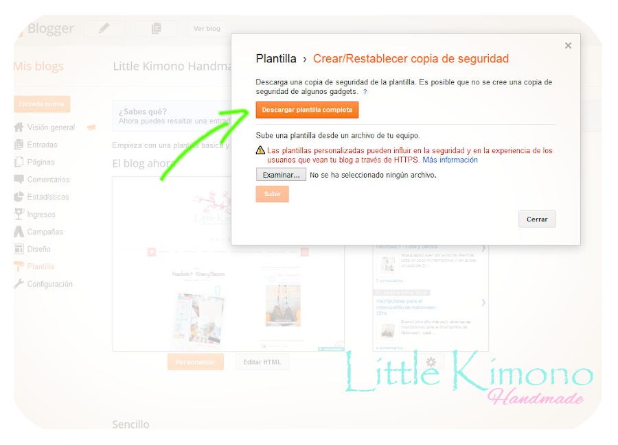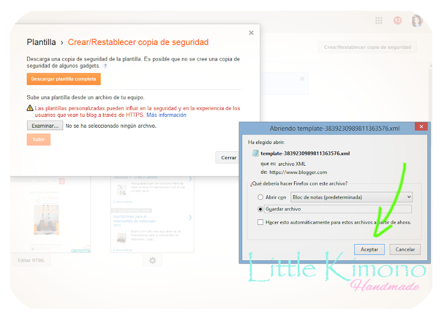 Del mismo modo que con la "copia de seguridad del blog" al guardar la plantilla obtendremos un archivo .xml que guardaremos en nuestro ordenador, para ello debemos: