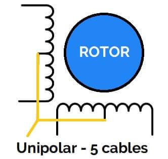 Si tiene 5 cables, probablemente sea unipolar y usará 2 para una bobina, 2 para la otra bobina, y uno para el común de ambas bobinas.