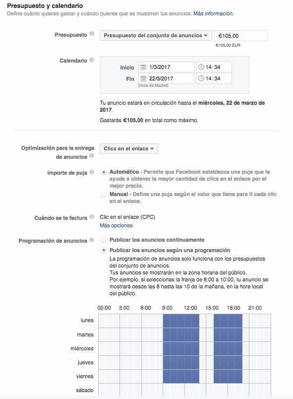 En esta parta puedes definir cuanto quieres gastarte al día, los días y horarios que vas a mostrar tu anuncio.