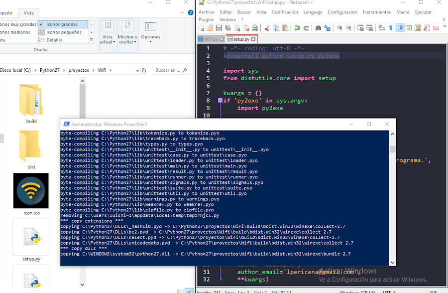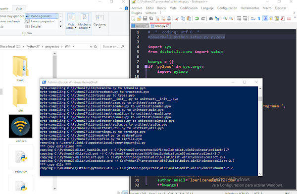Para compilar requerimos abrir la terminal powershell como administrador luego escribir powershell python setup.py py2exe .