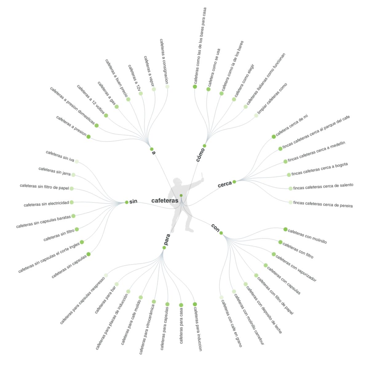 Pero lo que realmente hace especial a esta herramienta es la forma de mostrar los datos que da en forma de rosco y que saca keywords base a una keyword semilla en relación a:
