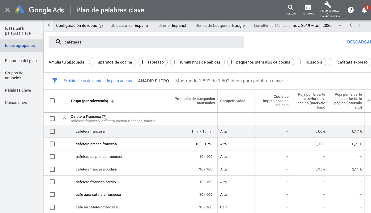 Además ahora podemos filtrar por palabras clave semilla o agrupadas desde el propio Keyword planner