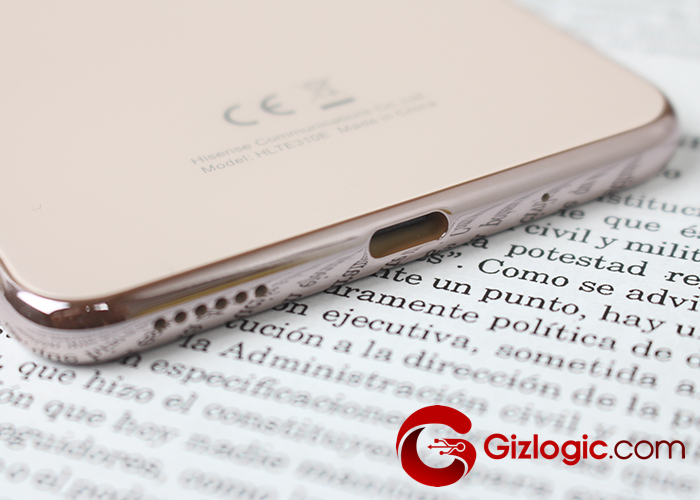 En el lado derecho tenemos la bandeja de tarjetas SIM y microSD, junto a un pequeño botón programable para iniciar aplicaciones a nuestro antojo o Google Assistant. En el canto superior tan sólo vemos un micrófono secundario. A la izquierda el control del nivel de volumen y botón de encendido. Por último, el micrófono principal, altavoz y conector USB-C. Hisense peca también de las grandes marcas eliminando el conector de audio jack.
