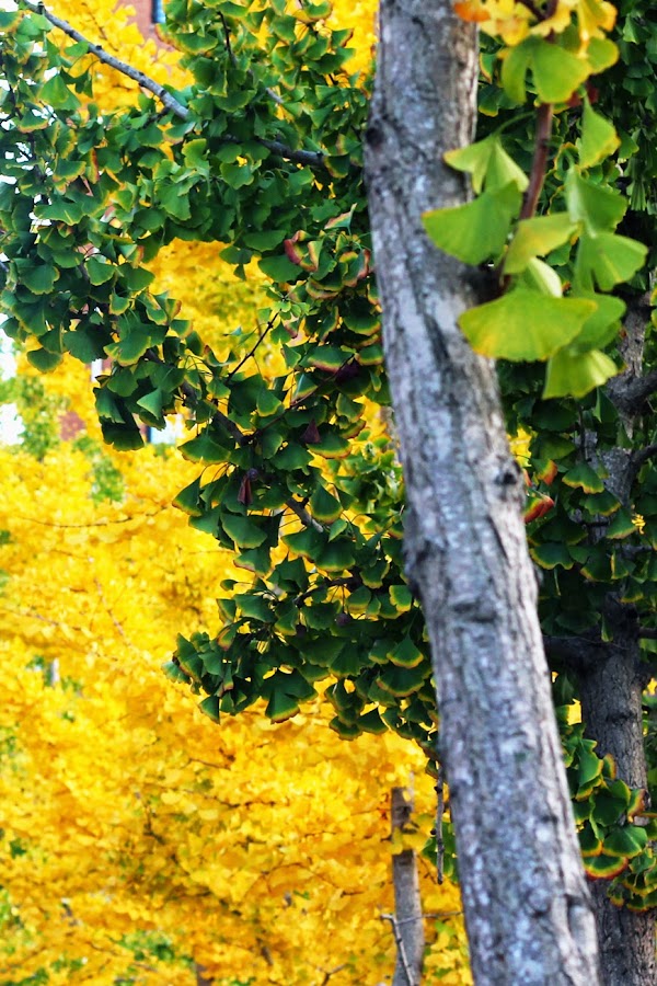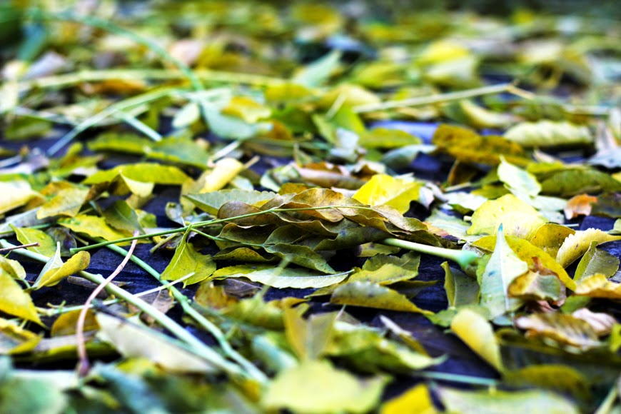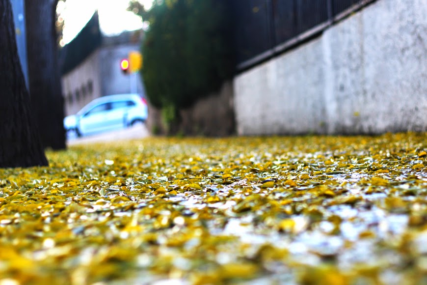 En estos últimos días ha llovido muchísimo en Barcelona y el aspecto de las calles ya no es lo mismo, pero me dio tiempo a fotografiar esta calle repleta de hojas amarillas que de vez en cuando aún se podían ver junto con algunas pocas verdes.