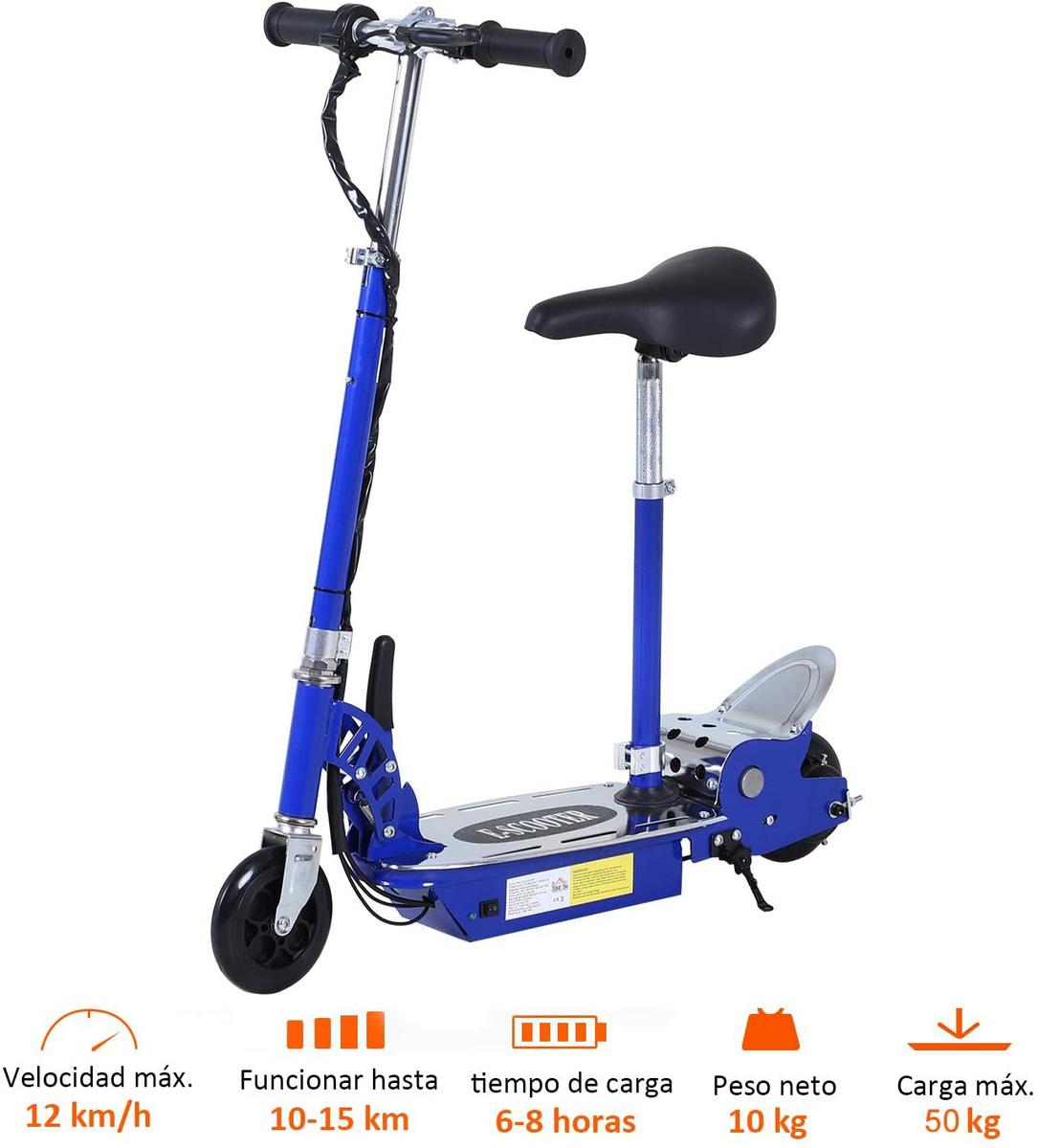 El Homcom patinete eléctrico es para niños de 8 años en adelante. Tiene una velocidad máxima de 12 km/h y una autonomía de 15km.