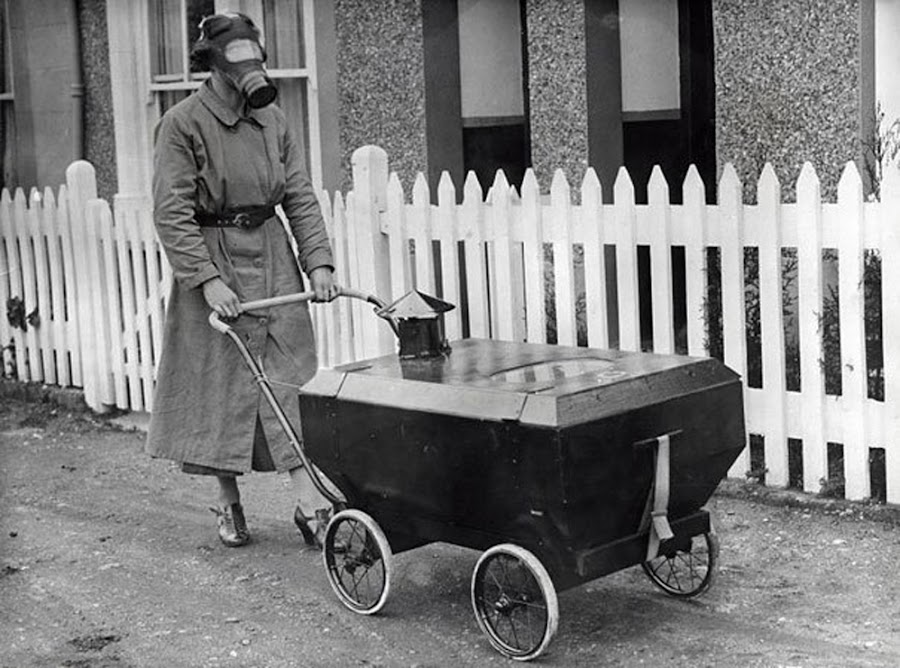Mujer con un cochecito resistente al gas, Inglaterra, 1938.
