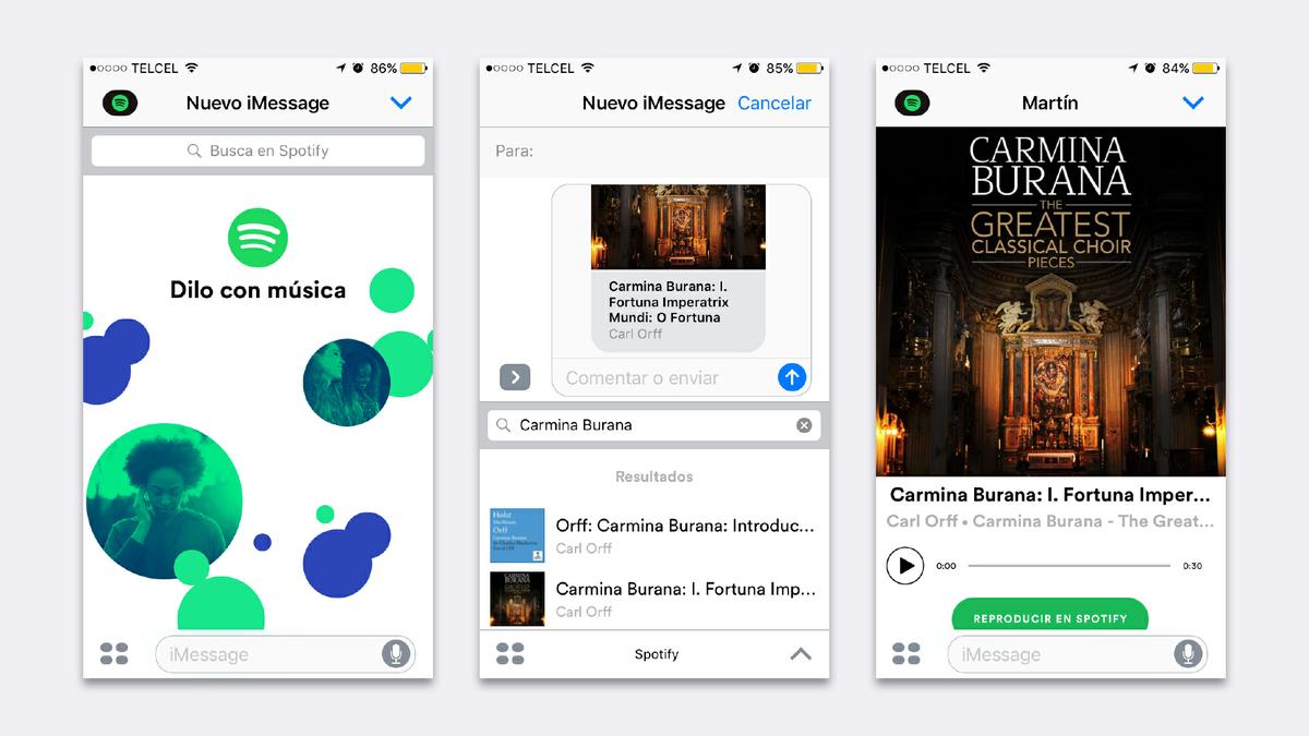 Para comenzar a usarla simplemente debes acceder a iMessage en tu iPhone con iOS 10.3 o superior, junto a la barra de introducir texto, dar tap sobre el ícono de Apps, buscar Spotify, instalarlo y listo; puedes de inmediato disfrutar de esta opción.