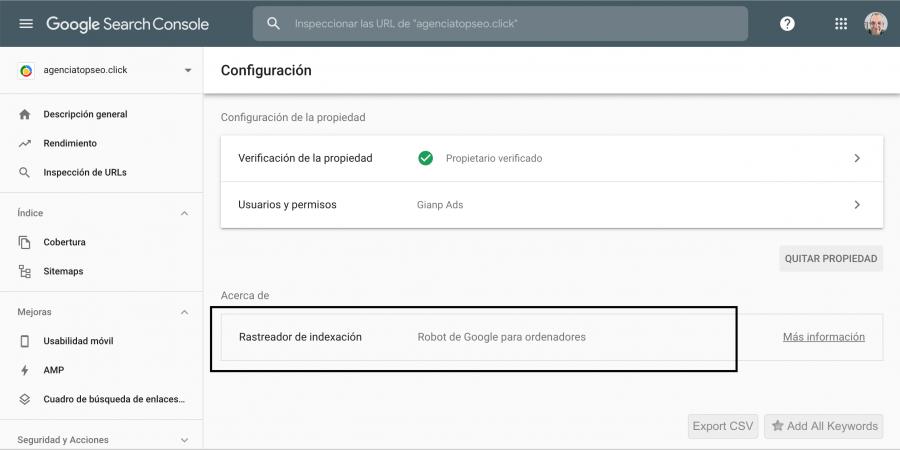Si recuerdas, hasta hace un par de días, al oprimir el botón Configuración en tu panel de Search Console; lo único que se hacía visible era el estado de la propiedad de tu sitio. Ahora se puede ver el tipo de rastreador con el que Google está monitoreando tu web.