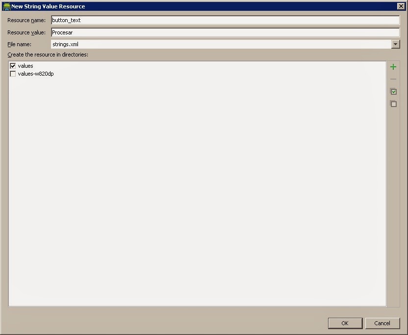 Guardamos y el recurso estará creado. Si deseas abre el archivo strings.xml y comprueba la existencia de los nodos que acabas de crear.<?xml version="1.0" encoding="utf-8"?>