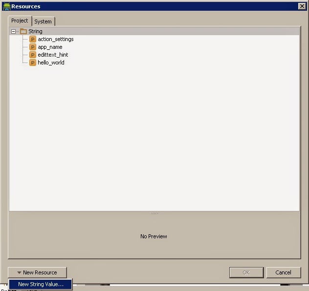 Ya que el recurso que necesitamos usar aun no existe, debemos crearlo. Así que haremos clic en "New Resource" y seleccionaremos "New String Value...".