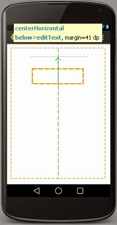 Al seleccionar el botón veremos que está ubicado en la parte inferior del editText, con una margen superior de 41dp y alineado horizontalmente. Estas características se representan con los atributos layout:margin , layout:alignComponent y layout:centerInParent.