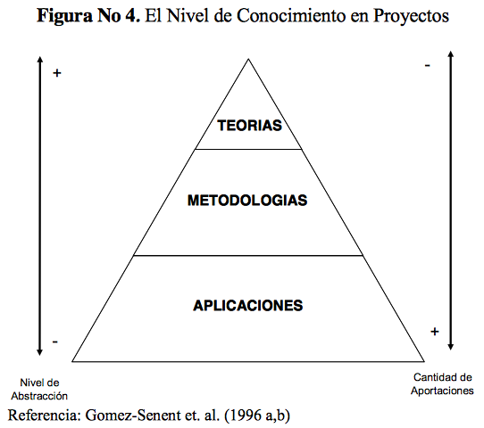 Para Go?mez-Senentt et al. (1996 a, b) el conocimiento sobre proyectos se puede organizar en tres niveles, las cuales pueden ir de menor a mayor abstraccio?n, y de mayor a menor volumen de aportaciones conceptuales. Ver Figura No 4.
