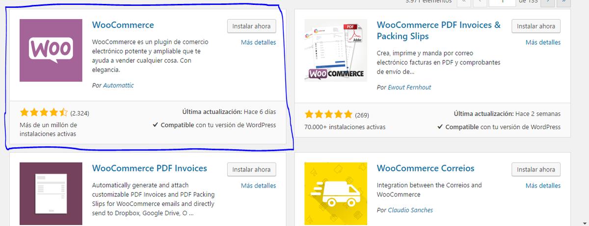 A partir de ahí verás una ventana como la que se muestra arriba. Esta vez lo que te interesa es el buscador, por lo que escribe en él “Woocommerce”. Verás que se nos muestran un montón de plugins, algunos de ellos son extensiones que te permiten crear facturas o conectar Correos con Woocommerce, el plugin que nos interesa a nosotros es el que he marcado en la imagen con ese trazo tan irregular.