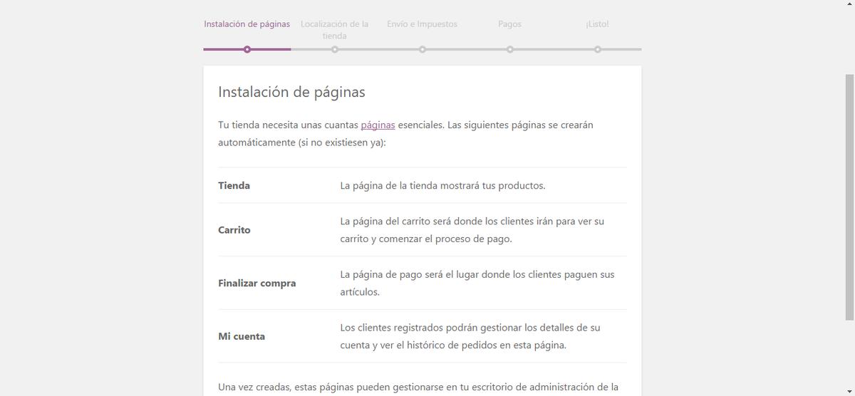 Instalación de páginas. Es el primer apartado del asistente de configuración y se trata de configurar que página va a contener la tienda, en cual se va a realizar el pago, etc. El mismo asistente te explica que página es para qué. Una vez le des a continuar Woocommerce creará estas páginas, sin embargo, si alguna no te convence, puedes cambiarla desde la configuración de Woocommerce, o no te gusta el título de tienda lo puedes cambiar desde la misma página, sin embargo, al volver a acceder a ella elimina la caché porque si cambias el título y no borras la caché no se te mostrarán los productos. Bien, una vez leído todo esto dale a “continuar”.