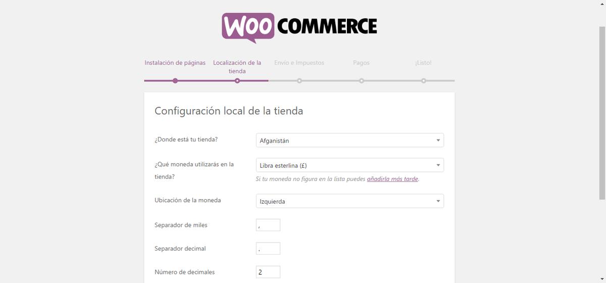 Localización de la tienda. No es solo decir desde donde operas, si no que también tienes que poner en que moneda te mueves, que será la que aparezca en la tienda; donde quieres que se sitúe el simbolo de la moneda en tu tienda, es decir, si quieres 15 pon que a la izquierda pero si quieres 15 pon a la derecha; el separador que quieres para miles, es decir, si quieres 1,000 o 1.000 o el símbolo que tu quieres; el separador que quieres para decimales, en España se utiliza tanto el punto como la coma; el número de decimales que quieres que se muestre, lo mejor es dos para que si pones algo a 15,99 se vea el último 9 también; y, por último las unidades por si vendes productos físicos. Después de configurar todas estas opciones dale a “Continuar” para seguir con el paseo.
