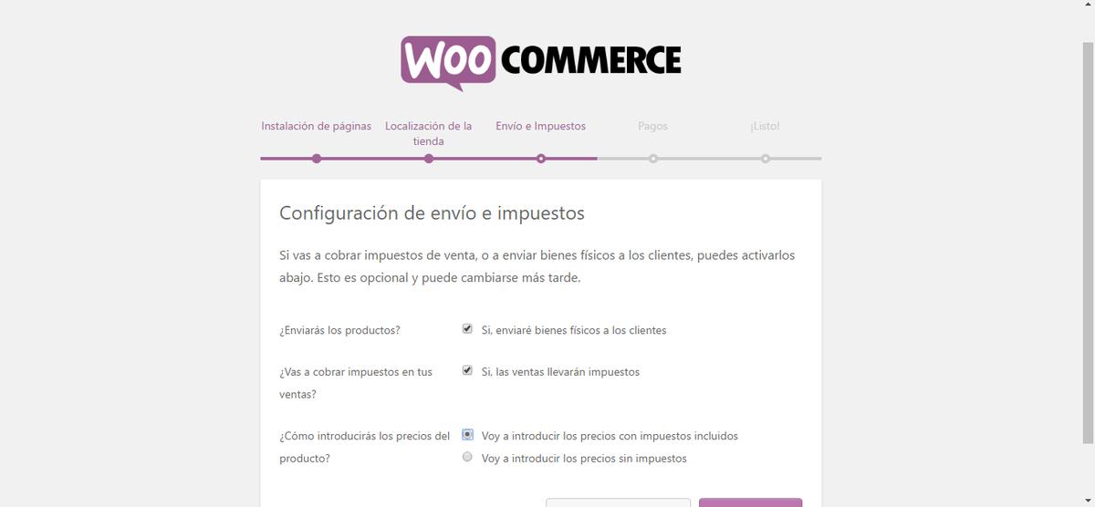 Envío e impuestos. Te metes en aguas pantanosas. La primera pregunta es fácil simplemente decir si vas a enviar los productos, sin embargo la segunda es más complicada porque el IVA suele depender del producto que vendas, sin embargo creo que aquí en España es obligatorio cobrar el IVA (infórmate por si acaso), por lo que en la segunda pregunta elegimos la opción “Sí, las ventas llevarán impuestos”. Esto hará que se despliegue ante ti una nueva pregunta simplemente elige si vas a añadir ya el precio con los impuesto o no y después dale a “Continuar”.