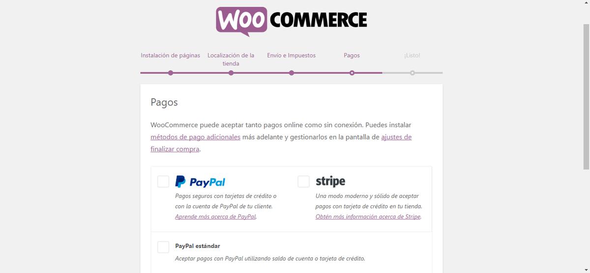 Pagos. Bien, llegamos a la parte que nos interesa, los pagos. Y es que no tiene sentido tener un ecommerce en el que no se reciben pagos. En esta página del asistente tenemos una lista de todos los tipos de pago que pueden elegir los usuarios. Lo normal y más recomendable es elegir PayPal, porque es mucho más cómodo para algunos usuarios; Stripe, que permite los pagos con tarjeta, aunque con el PayPal que no es estándar también se puede algunas personas al ver PayPal piensan que solo pueden pagar con el saldo de la cuenta o si tienen cuenta; y, transferencia bancaria, es la menos usada pero algunos usuarios la consideran más segura que ninguna, por lo que te recomiendo ponerla. Esas son mis recomendaciones a partir de ahí tú puedes elegir la que más se ajuste a ti y a lo que buscas. Pero recuerda que tanto PayPal como Stripe no son simplemente elegirlas y comenzar a recibir pagos, sino que hay que integrar ambas plataformas con tu ecommerce, algo sencillo, pero un poco extenso, que veremos más adelante.