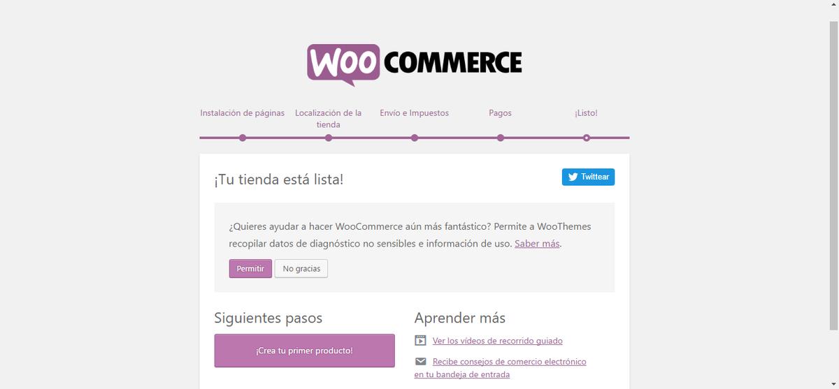 ¡Listo!. Y ya hemos terminado. En esta página tú decides si quieres que puedan recopilar datos de diagnostico y se te invita a crear tu primer producto, si has creado ya alguna entrada o has estado trasteando con ellas te será fácil de hacer.