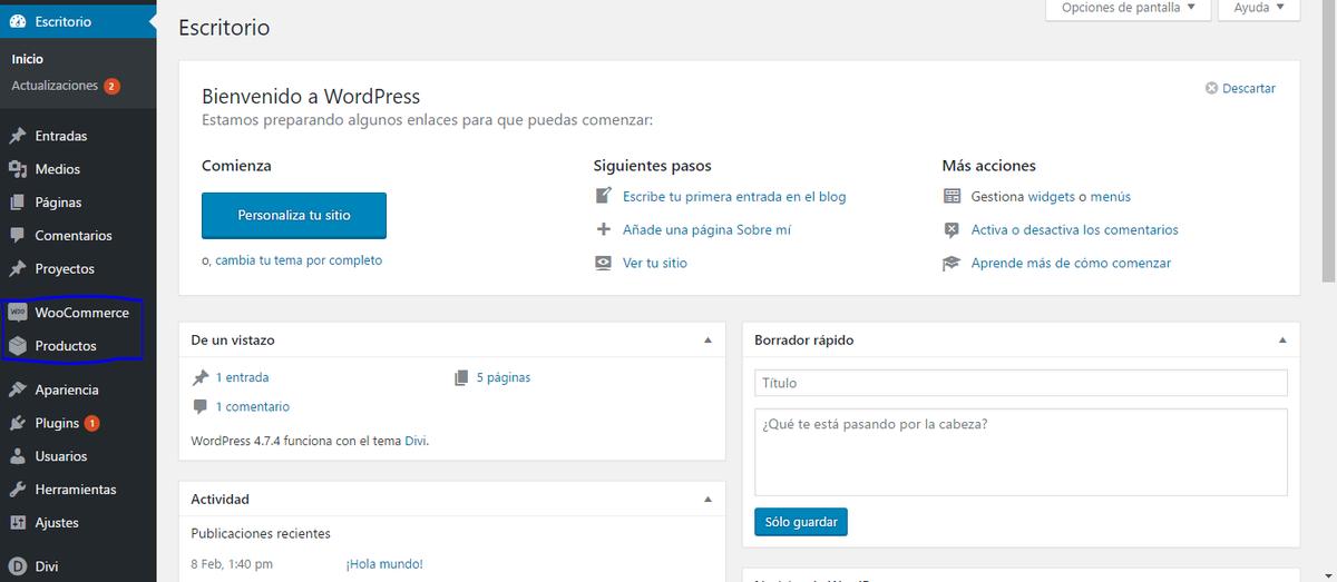 Como has podido ver los primeros pasos con Woocommerce son fáciles de dar, sin embargo esta es la configuración básica, hay una más extensa que veremos más adelante, pues una casa nunca hay que construirla por el tejado. Ahora te recomiendo trastear un poco con las opciones de Woocommerce: crear algún producto, categorías, cupones de descuento… Para probar todo esto simplemente tienes que dirigirte a la barra lateral izquierda donde verás que se han creado dos nuevas pestañas: “Woocommerce” y “Productos”. En la primera puedes ver los pedidos, crear los cupones, ver los informes… Y en la segunda puedes añadir productos, ver los que hay, crear categorías…