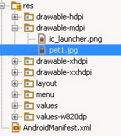 Automáticamente Android Studio refrescará nuestro proyecto y mostrará el archivo pet1.jpg en la carpeta de recursos: