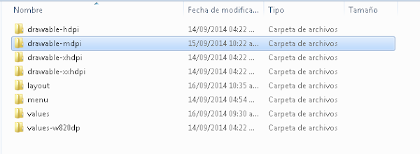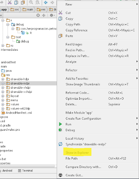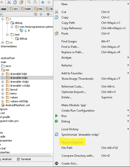 Ahora ubícate en la carpeta "drawable-mdpi" y presiona click derecho. Elige la opción "Show in Explorer":