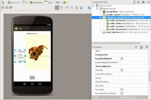 Si observas el Component Tree verás nuestro RadioGroup como padre de 4 radios. En este caso usaremos cuatro distintos de belleza: "Hermoso", "Lindo", "Normal" y "Horroroso". Cada texto podemos implementarlo en el atributo text de los radiobuttons.