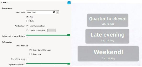 Si has instalado Binary Clock, Fuzzy Clock viene con él, ya que están en el mismo paquete. Este reloj es una forma imprecisa y divertida de contar el paso del tiempo, ya que no muestra la hora o el minuto exacto. En lugar de eso, detalla el valor más cercano, describiendo el tiempo de acuerdo al grado de imprecisión. Cuanto más alto sea el grado, más general se vuelve el Reloj Difuso, por lo que sólo puede decir «Fin de semana», por ejemplo. Usar este reloj es similar a preguntarle a tu descarado sobrino qué hora es. El módulo de configuración de este Plasmoid le permite ajustar un poco más que el color, para que pueda alterar la fuente, ajustar la altura del texto y cambiar la forma en que se muestra la fecha.