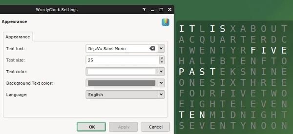 Puede modificar la apariencia de Wordy Clock cambiando los colores y la fuente. Recuerde que el fondo Plasmoid depende de su tema Plasma actual, así que si no quiere que sea transparente, compruebe su configuración en «Ajustes del sistema -> Apariencia del espacio de trabajo -> Tema de escritorio» e intente encontrar un tema con un fondo de widget opaco.
