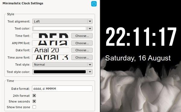 Aunque no es tan estrafalario como otros relojes de esta lista, Minimalistic Clock es hermoso en su simplicidad, y puedes cambiar casi todo: alineación del texto, sombras, color de fondo y de texto, formato de fecha, y fuentes tanto para la fecha como para la hora. Este reloj es el que más me gusta porque es sutil pero visualmente llamativo, y puedes convertirlo fácilmente en algo exótico exhibiéndolo en una fuente inusual.