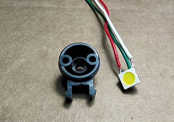 Ahora empiezo con el MAN KAT 1 de JJRC. En cuanto a compatibilidad con la marca WPL es casi 100%. Aún así, sigue siendo un juguete. Para eso estoy añadiendo modificaciones para añadir al receptor, tales como intermitencias o luces cortas y largas, también la marcha atrás y el freno. Para las luces largas y cortas voy a utilizar un led SMD de los "gordos". Cómo se ve en la imagen este Led tiene 3 leds en su interior y un cátodo común ( - ). De esta forma tengo las luces cortas encendiendo solo uno, y al encender los tres será la luz larga.