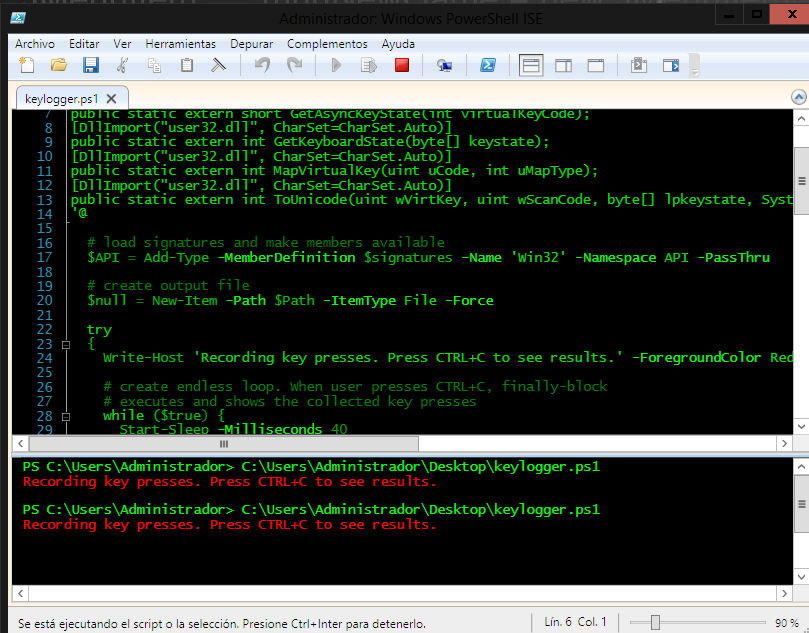 Luego de copiar el codigo en un editor de texto "blog de notas" se guarda con el nombre keylogger.ps1