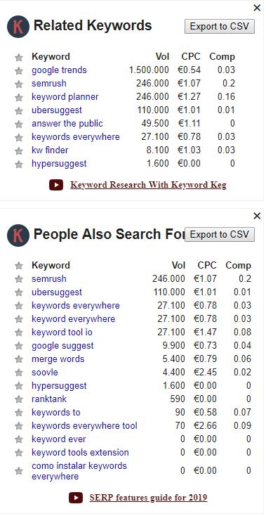 Es lo más simple que tenemos para las búsquedas que necesitamos que sumado a la extensión de keywordseverywhere hace que tengamos el CPC y el número de búsquedas por meses de cada palabra que estemos buscando en Google.