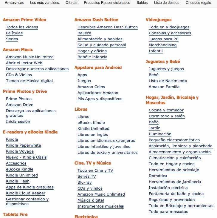 Si haces clic en “Todos los departamentos“, vas a acceder a una lista que contiene todas las categorías y cuando clicas en una de ellas te muestra las subcategorías. Es cuestión de que revises la categoría de los productos que vendes y tendrás una idea muy clara de cómo puedes estructurar el sitio o como ordenar los productos que ofreces. Cuanto más específico sea el tipo de productos que vendes más fácil será posicionar tu tienda online. No es lo mismo crear una tienda de artículos deportivos, donde estarás compitiendo con Decathlon (que por cierto, son unos cracks del SEO) o Nike. que crear una tienda online especializada en equipamiento para jugadores de fútbol, o incluso sería mejor crear una tienda especializada en ropa de portero, como esta. A mayor especialización, más posibilidades tendrás de posicionarte en Google.